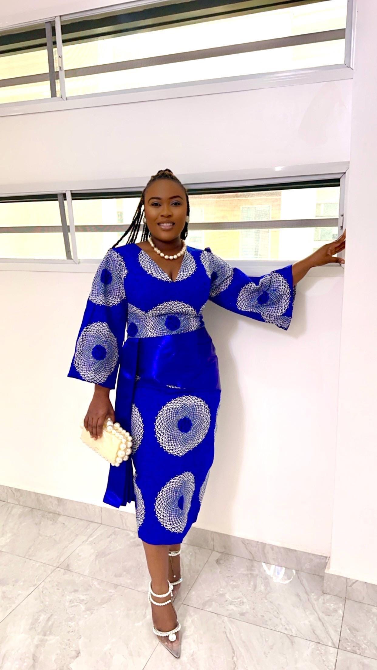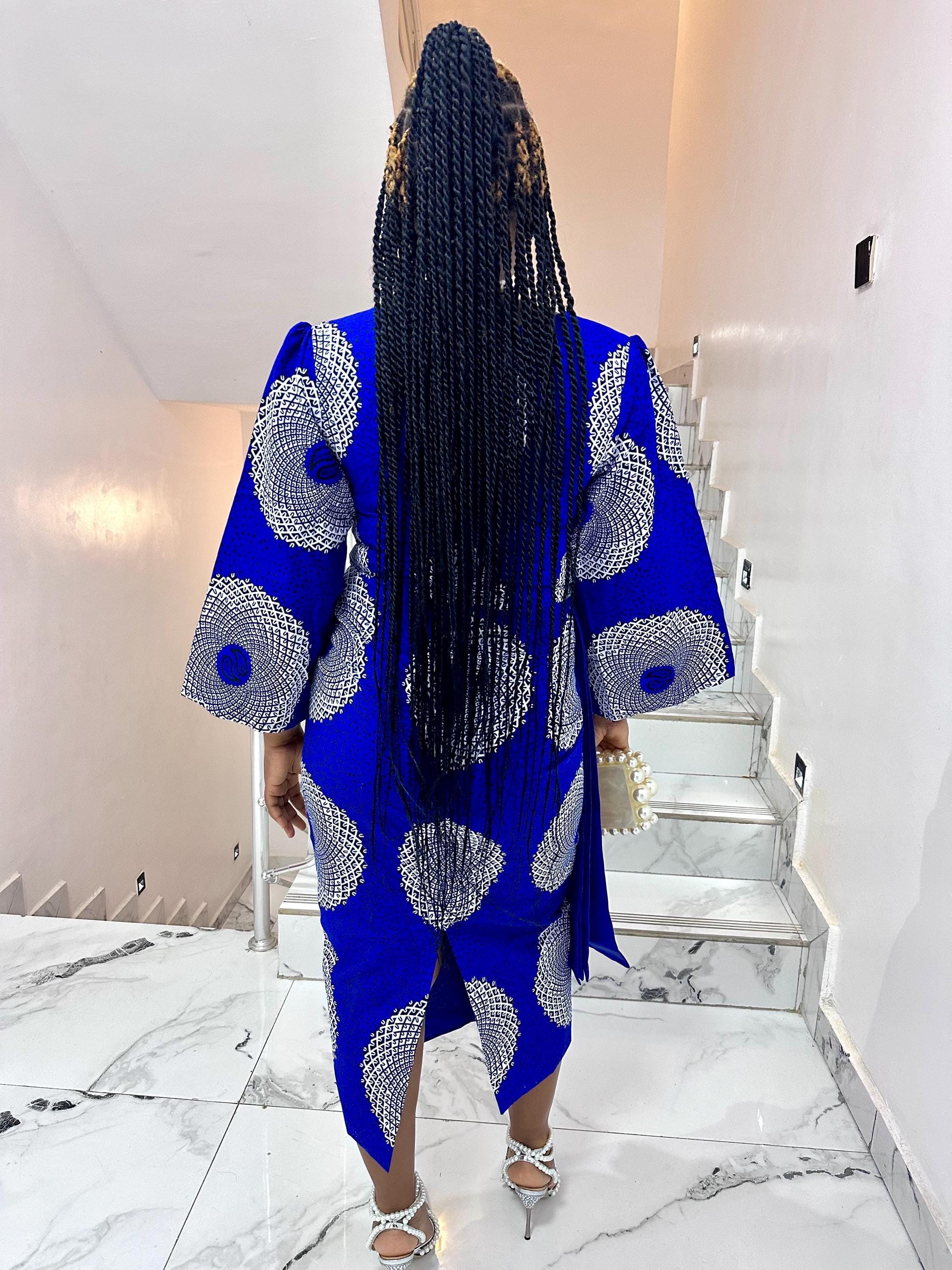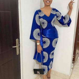 Blue African Ankara Midi Dress is Made from 100% African Wax Cotton; this Blue and white Ankara outfit is neatly tailored with great finishing. Outfit comes with free headwrap. please ensure that you look through our size chart and select your correct measurements. alternatively, you can send your measurements to us and we will custom make your item at no additional cost.