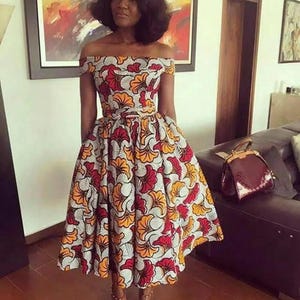 Blue off shoulder African Ankara Fit & Flare Midi Party Dress For Ladies With Headwrap: Stylish African Dresses For Plus Size Wedding Guest