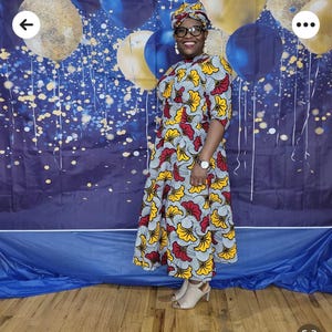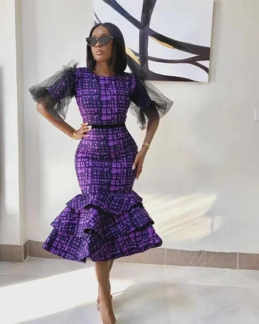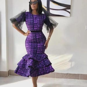Purple African Ankara Print Fit & Flare Party Midi Dress with Layers for Plus Size Women with Headwrap, Ankara dress, African clothing