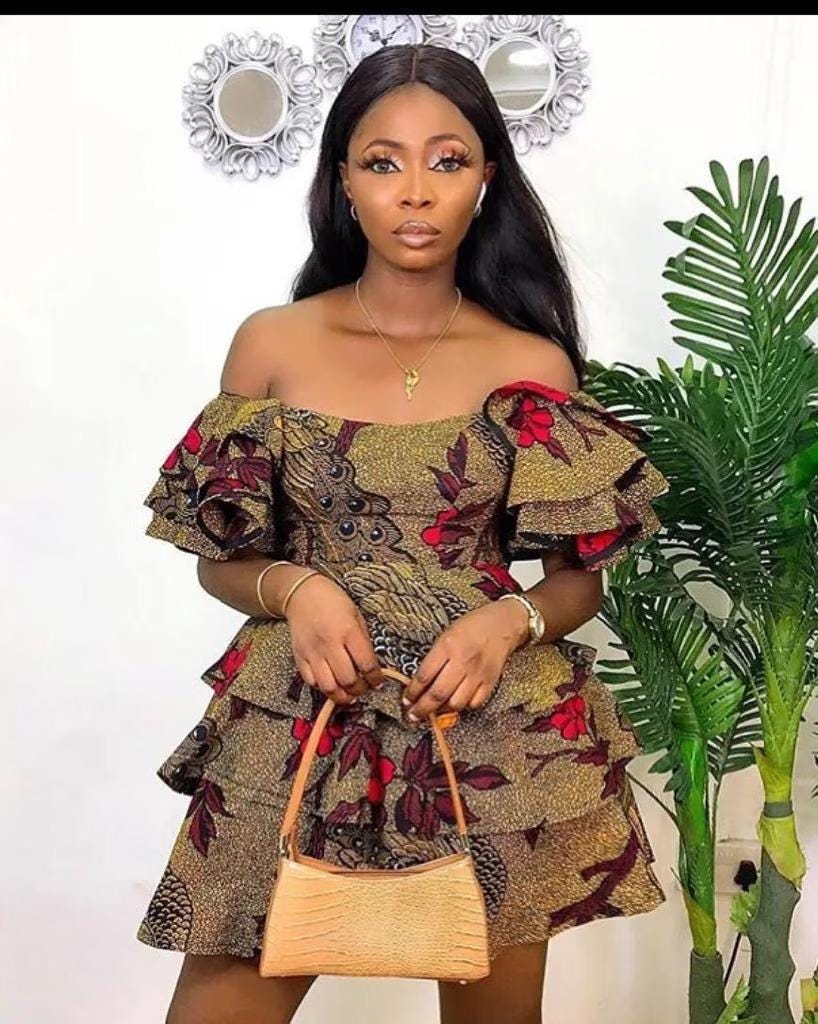 Brown Off Shoulder Africa Ankara Short Party Dress For Ladies With Headwrap, Africa Dress, Ankara Dress, Africa Clothing, African Gown Style