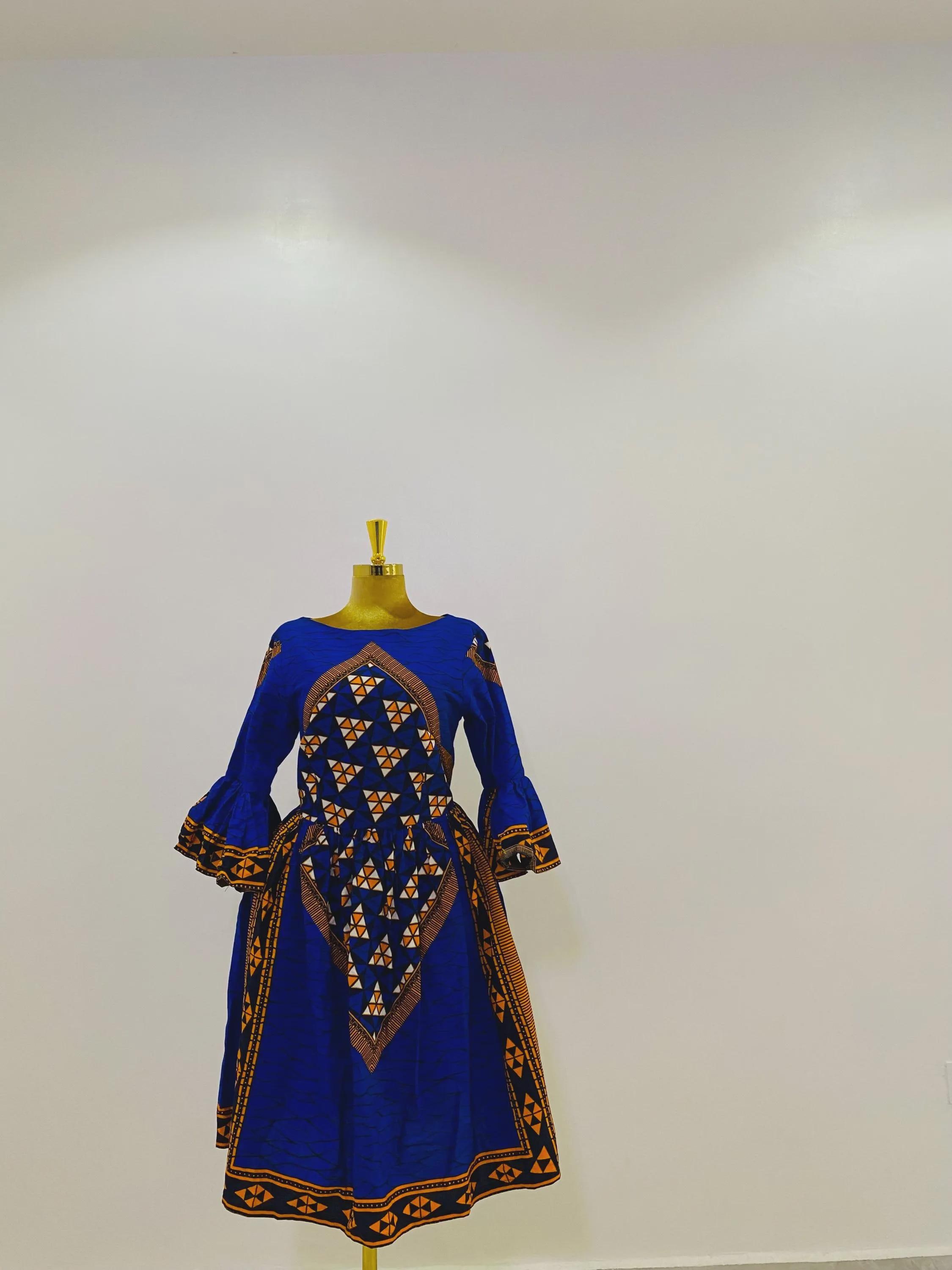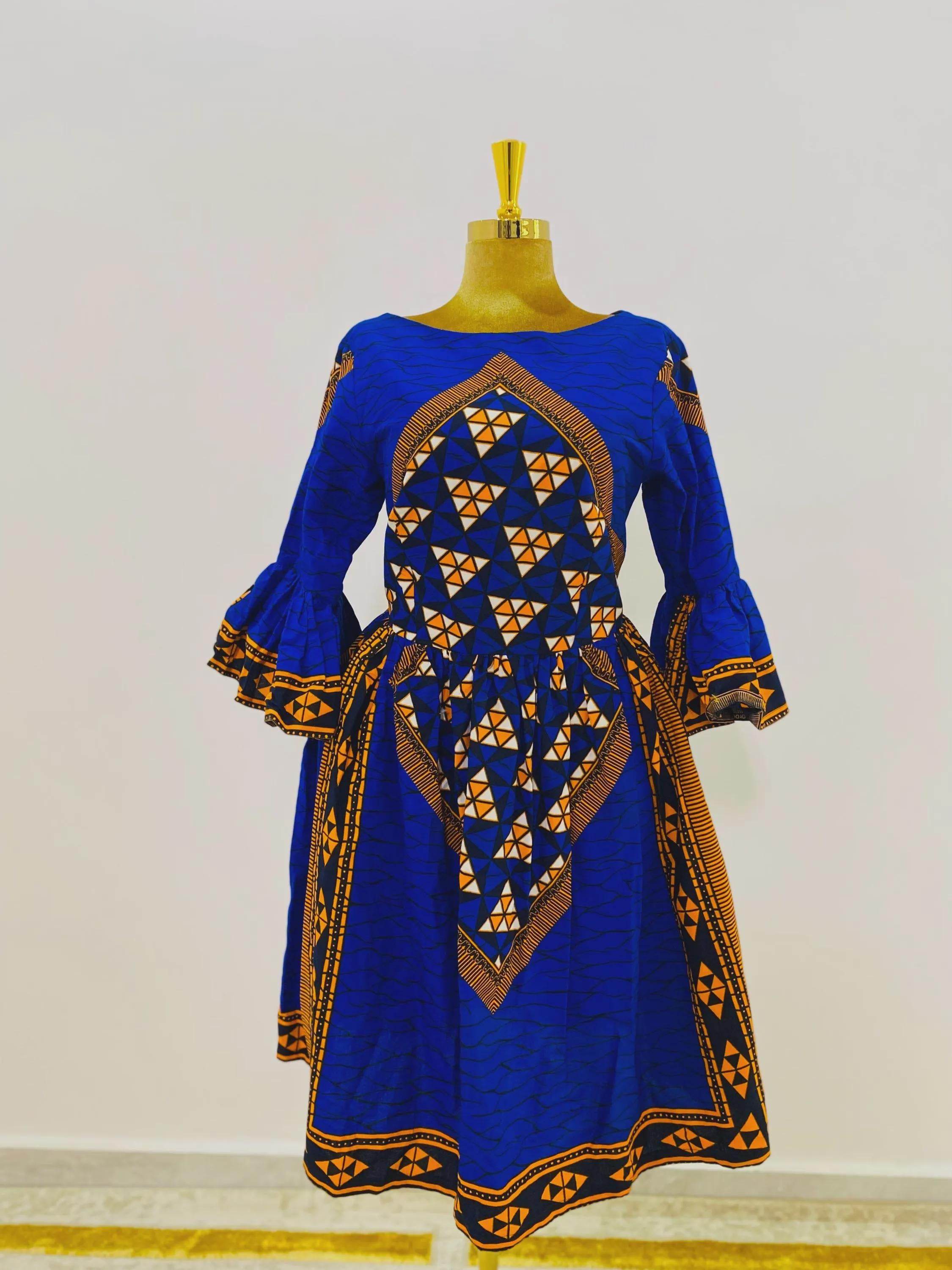 African Ankara round Neckline Fit & Flare Midi Dress is Made from 100% African Wax Cotton; this Blue and yellow Ankara outfit is neatly tailored with great finishing and good for all occasions. Outfit comes with free headwrap.